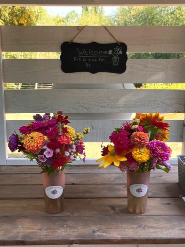 When you arrive at the farm, you will be greeted by our sweet little flower cart that holds cups and clippers for you to use. The cups fit perfectly in a car's cup holder and make it simple to transport arrangements home or to a loved one. With over 30 varieties of flowers to choose from, you can let your imagination run wild. Start with a favorite color, or perhaps a favorite bloom. Maybe you like to create a base of fillers first, then add in your "wow" flowers. The best part; there's no wrong way to make a bouquet.
